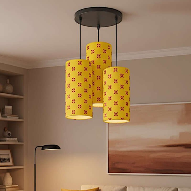 Illuminate your space with a pop of color and unique design with this 3 Set Cluster Hanging Light. Perfect for making a statement in your hall, living room, or bedroom, this pendant light features three beautiful cylindrical lamp shades, each boasting a vibrant, hand-printed motif design on fabric. The bold yellow and red pattern adds a cheerful, artistic touch to any decor style.