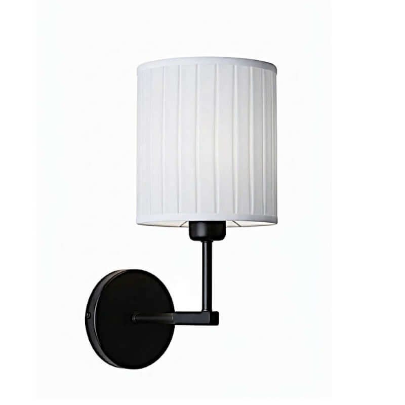 A sophisticated black metal wall light with a pleated fabric shade, offering soft, diffused light for bedrooms and living spaces.