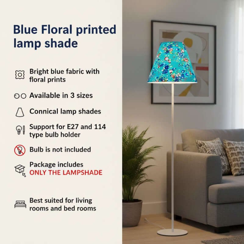Elevate your living space with our stunning Blue Floral Printed Conical Lamp Shade. Crafted from bright blue fabric adorned with vibrant floral prints, this shade adds a pop of color and style to any room. It is designed to be compatible with both E27 and E14 type bulb holders, making it versatile for most standard lamp bases. Available in three sizes to perfectly fit your needs, this lampshade is best suited for enhancing the ambiance in your living rooms and bedrooms. Please note: The bulb is not included, and the package contains ONLY THE LAMPSHADE.