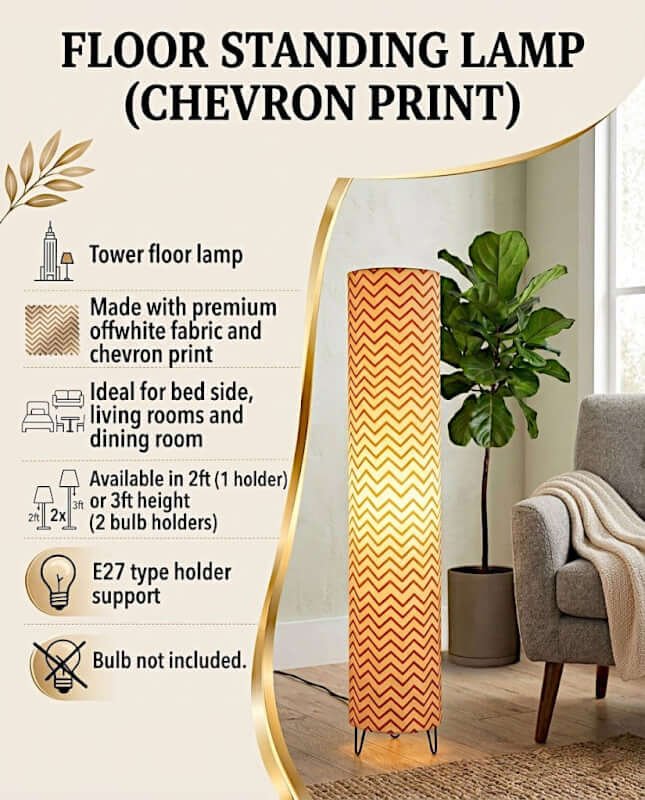 The tower floor lamps are a great way to add charm to your rooms and is an easy way to draw attention to you exquisite decor sense. The chevron tower lamp is designed to offer you a contemporary and chic look to your living room / bed room or dinning room space. The light cream fabric is neutral and works great with almost all types of decor and colour scheme that you may have for your room. The design lights up beautifull and does its bit to elevate the decor quotient of your ambience. Just what you need when you are looking for a modern yet simple floor lamp.