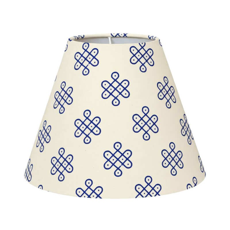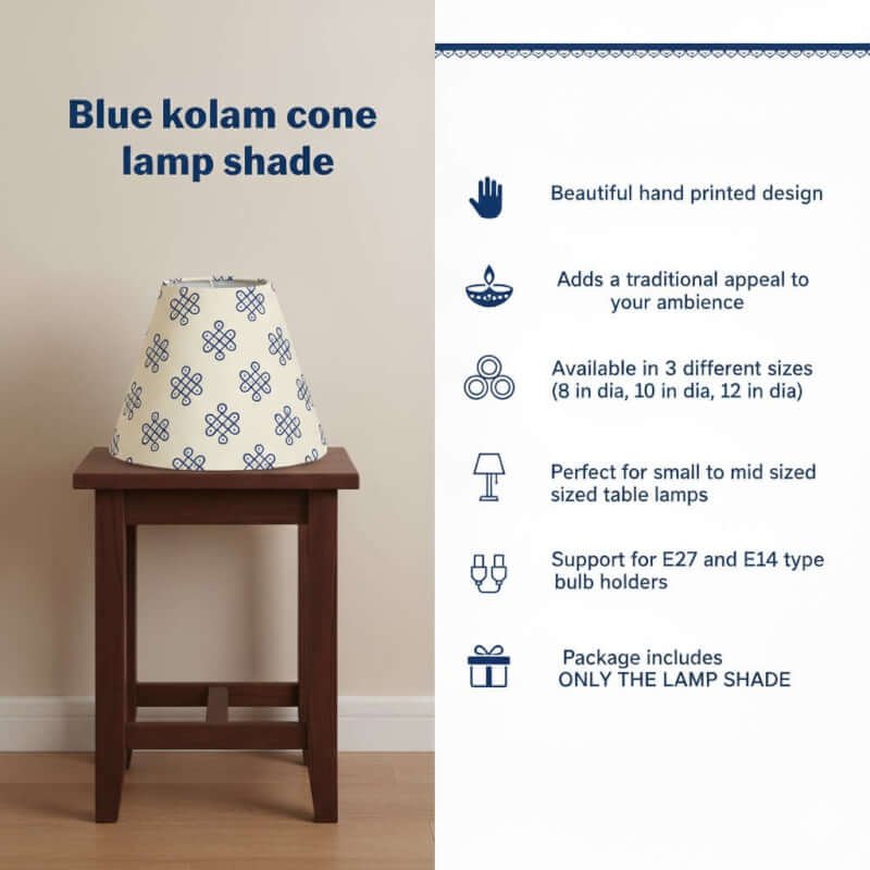 Illuminate your space with the Blue Kolam Cone Lamp Shade, a beautiful blend of traditional Indian artistry and modern design. Each shade features a hand-printed kolam design in striking blue against a calming cream background, instantly adding a warm, cultural appeal to any room’s ambiance.