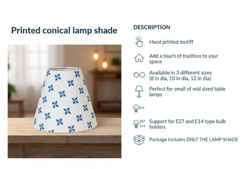 Enhance your home décor with this elegantly designed cone lamp shade, featuring a sophisticated indigo blue print on a light cream fabric. Perfect for adding a touch of style and warmth to any space, this lamp shade cover fits effortlessly on most standard table and floor lamps.