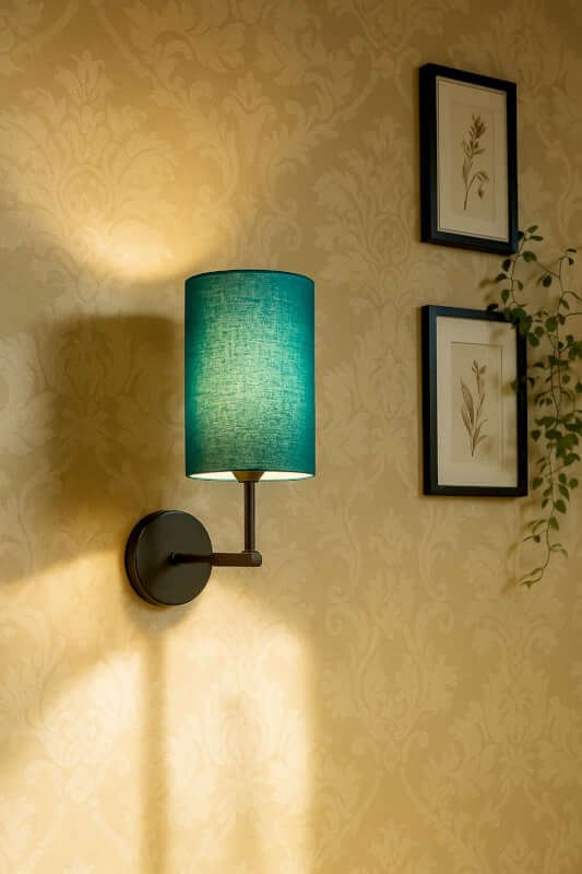 Introducing our Decorative Wall Lamp, a captivating blend of modern design and timeless charm. The metal wall mount fixture not only provides sturdy support but also adds a touch of sophistication to your living space. The cylindrical lamp shade, crafted from peacock blue fabric, exudes elegance and warmth, casting a soft and inviting glow.