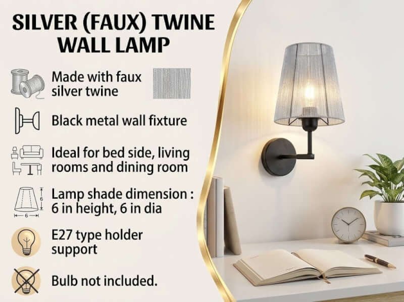 Enhance your home’s ambiance with our Faux Silver Twine Wall Lamp. This elegant wall-mounted fixture features a 6″x6″ conical woven shade in a metallic silver finish, paired with a durable matte black metal base. Compatible with E27 bulbs, it is the perfect lighting solution for bedside reading, entryway accents, or hallway illumination.