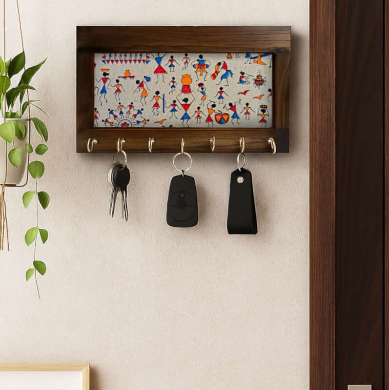 Add a touch of tradition and functionality to your home with this beautifully handcrafted wooden key holder. Made from premium teak wood, this piece showcases a timeless Warli art design at its center — a tribute to the rich tribal heritage of India. The intricate Warli pattern, hand-painted with care, adds a rustic charm that complements both modern and ethnic interiors.