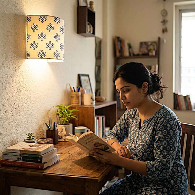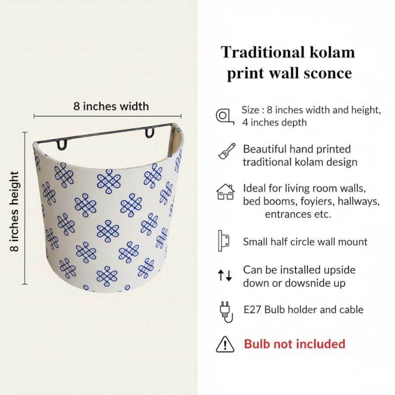 Each sconce features a hand-printed traditional Kolam design, a beautiful geometric art form traditionally drawn at the entrance of homes. This intricate, auspicious pattern transforms the lamp into a piece of functional art, casting a warm and inviting glow.