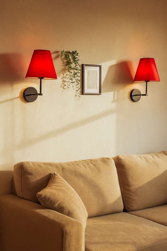 Elevate your living space with this striking wall-mounted lamp featuring a vivid red conical fabric lampshade and a sleek matte black metal fixture. Designed to add a touch of warmth and elegance, this handcrafted piece effortlessly blends contemporary form with timeless charm. The bold red shade casts a soft, ambient glow—perfect for creating a cozy and inviting atmosphere in your living room, bedroom, or hallway.