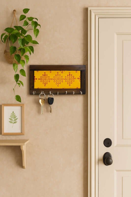 Striking and pretty – A wooden key holder with a beautiful fabric inlay with a traditional block printed Kolam design. Light weight and easy to mount of the wall. Comes with 7 hooks to comfortably store all your keys at home safe.